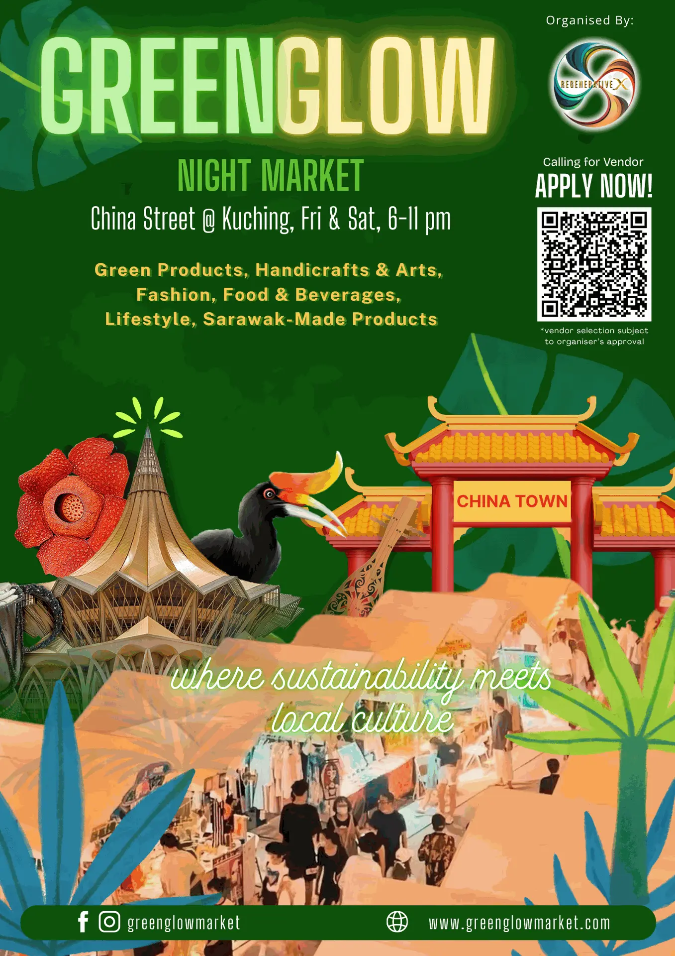 KUCHING, SARAWAK – The Regenerative X Association is proud to announce the upcoming launch of the Green Glow Night Market, a pioneering pilot project set to transform the historic Jalan China & Upper China Street into a vibrant weekend hub. Slated to begin its monthly run on 10th October 2025, the market will operate from 6:00 PM to 11:00 PM every Friday and Saturday.